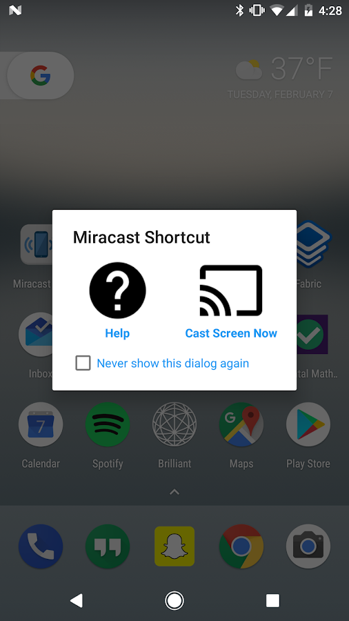 Esta aplicación ofrece un acceso directo y fácil widget para utilizar la función de screencasting pantalla externa Miracast incluido en Android 4.2 y superior! Con esta aplicación, usted será más conveniente ser capaz de reflejar la pantalla o utilizar la función de reparto de las aplicaciones compatibles.