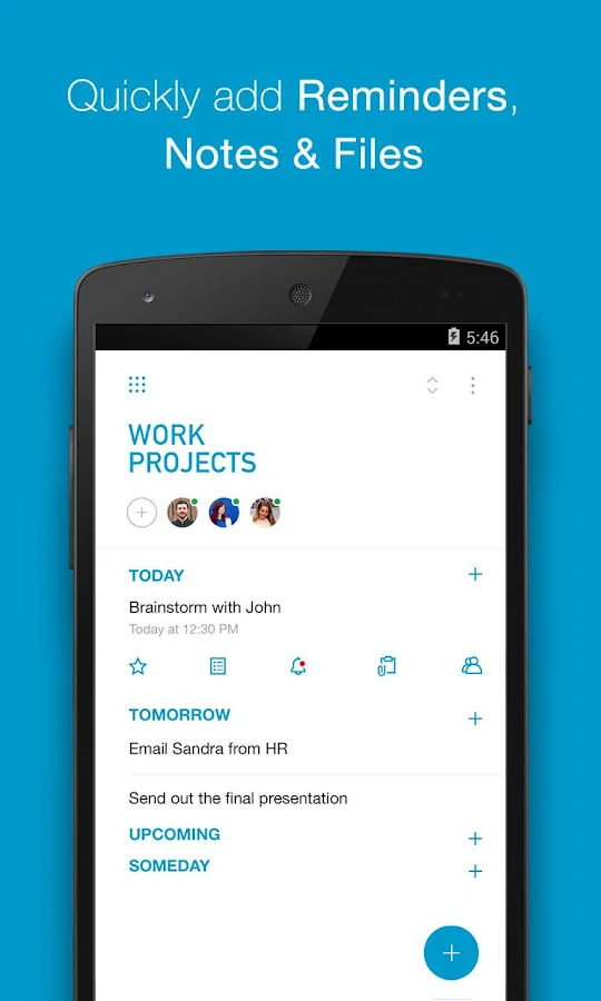 Arrastra y coloca las tareas para planificar tu agenda, desliza una tarea para marcarla como realizada, y agita el dispositivo para borrar las tareas terminadas. Incluso puedes añadir nuestro widget a la pantalla de inicio. Te hace sentir bien.