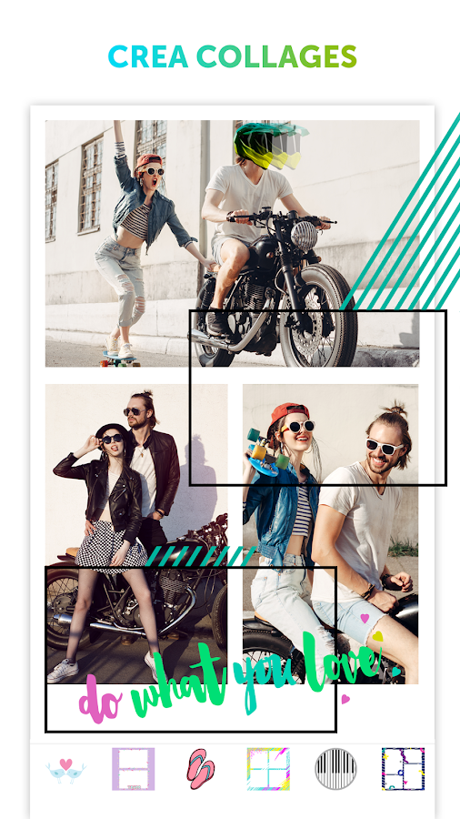 El creador de collage provee 100s de plantillas gratuitas, y la comunidad sube 1000s de nuevas imágenes cada día que pueden ser usadas como fondos. PicsArt te permite crear collages de imágenes estilo cuadrícula, con plantillas y de libre distribución. ¡Waw!