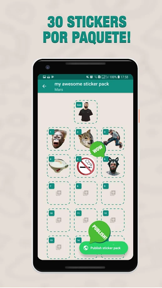 Crea tus propios paquetes de Stickers de WhatsApp. Puedes usar memes o tus propias fotos. Cualquier foto de tu teléfono funcionará